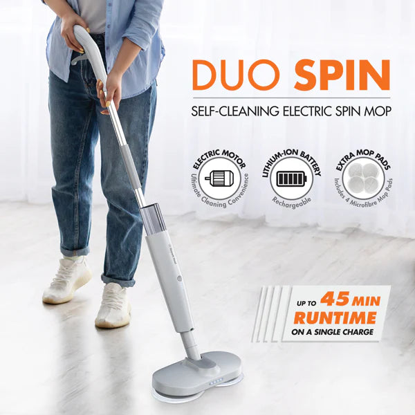 Rechargeable electric spin mop with dual-action bucket for enhanced mop-pad cleaning. Hard floor cleaning made easy! Let your hard floors sparkle with the Bennett Read® DUO SPIN Electric Spin Mop. With double rotating microfibre mop pads that do the hard work for you & innovative dual-action bucket that self-cleans & dries the pads so you can achieve a pristine finish, with a fraction of the effort! Dual-spinning electrical mop heads for ultimate cleaning convenience. Duo Spin's motor technology provides you with ultimate ease-of-use & effective cleaning power. Super-compact, cordless & lightweight, so your hard floor cleaning is effortless. Dual-action, self-cleaning mop head. Simply press the mop head into the dual-action bucket system to clean, then release with one “click” to rinse off excess water & continue washing your floors. Brilliant cleaning. With convenient Trigger Spray function for dispersing detergent & unique LED Mop Light that is perfect for assessing cleanliness & cleaning in darker areas. Versatile accessories. Includes: Cordless spin mop, dual-action bucket system, 4 x mop pads & charger. Extended guarantee. Your Bennett Read® DUO SPIN comes with a 1 year guarantee. Register your guarantee online at www.bennettread.co.za/warranty and we’ll extend it to a full 2 years.