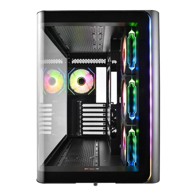 The FSP M580 ARGB ATX Gaming Chassis is a masterclass in modern case design, featuring a striking 270° panoramic curved glass exterior that offers an unobstructed view of your build. The seamless integration of tempered glass and a rounded chamfer design gives this case a futuristic and elegant aesthetic, making it a true centerpiece for any gaming setup. Built with both style and performance in mind, the M580 enhances the gaming atmosphere by blending high-end visuals with functional engineering.